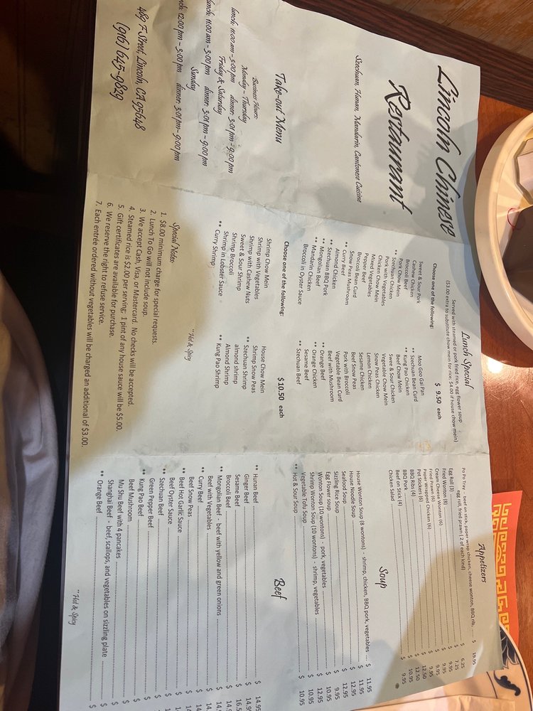 Lincoln Chinese Restaurant in Lincoln, California offers a diverse menu of Szechuan, Cantonese, and seafood dishes. The restaurant provides various amenities such as reservation options, takeout, delivery, and wheelchair accessibility. Customers rave about the delicious food quality, generous portion sizes, and friendly staff. From classic Americanized Chinese flavors to authentic and fresh dishes, Lincoln Chinese Restaurant caters to a wide range of tastes. The extensive menu includes favorites like orange chicken, fried rice, wonton soup, sweet and sour chicken, and more. While some customers mention the pricing as slightly high, the overall dining experience, customer service, and ambiance make it worth a visit. With happy hour specials, outdoor seating, and catering options, this restaurant is a great choice for groups, families, or a casual lunch or dinner outing.